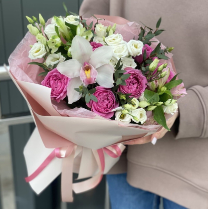 Букет с орхидеей "Дарья" с добавлением роз и эустомы