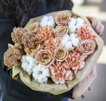 Чудесная композиция из роз, альстромерий и гиперикума с добавлением фисташки